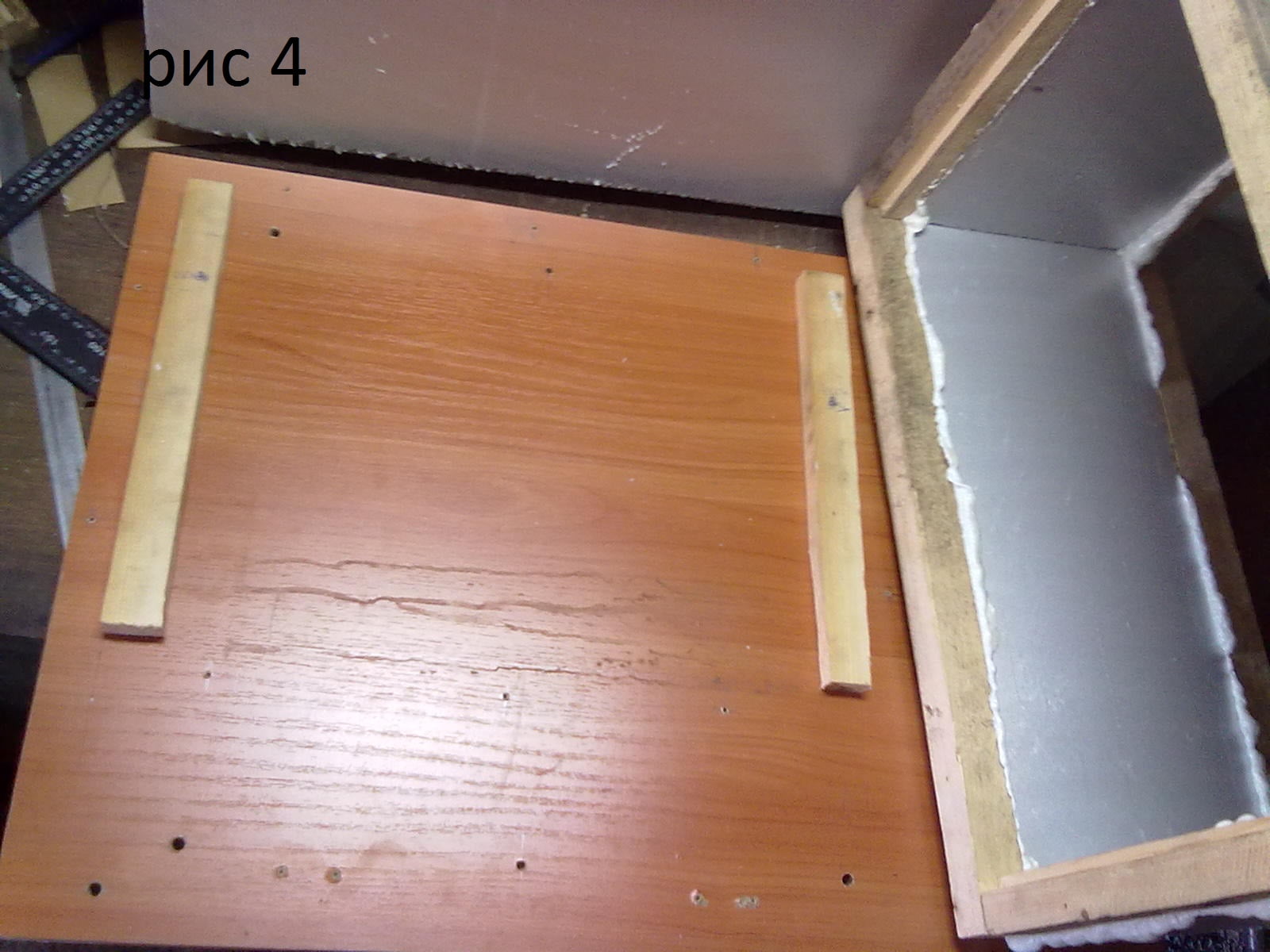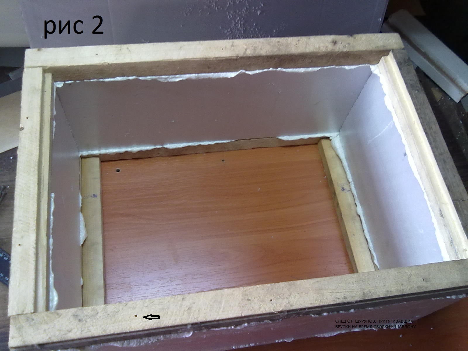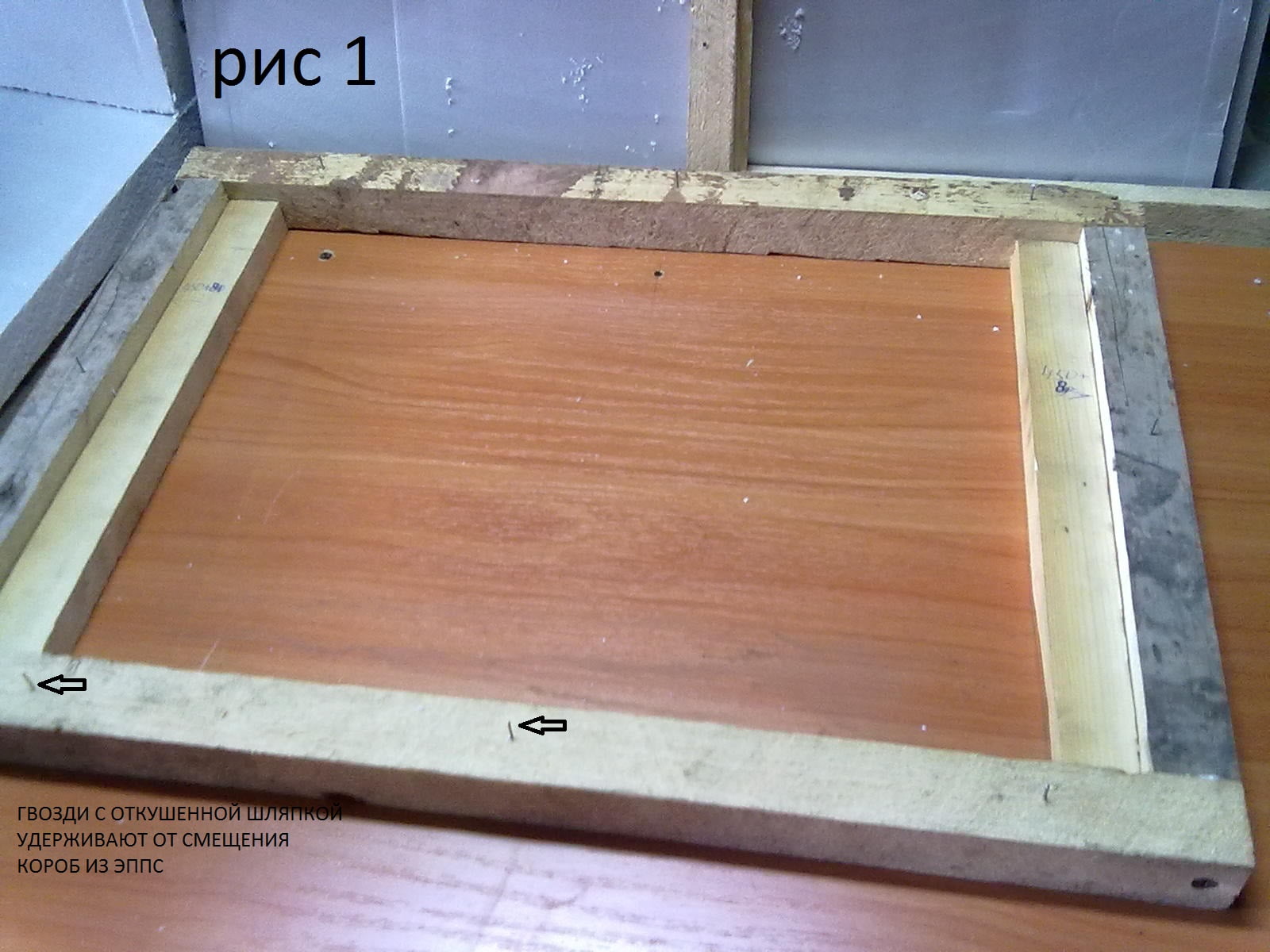 На влажную (для крепости сцепления) раму на полиуретановую пену собрал и поставил короб из ЭППС, сверху верхняя рама , прижал листом ДСП чтобы выровнять и сверху груз (рис 2).