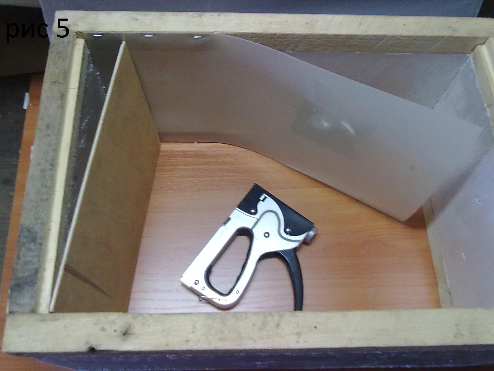 вставляем внутрь(рис5) фанеру или тонкий пластик (лавсан,ПЭТ,ПЭТФ) на толстую скобку 14, красим снаружи.(алкидно-уретановый лак)