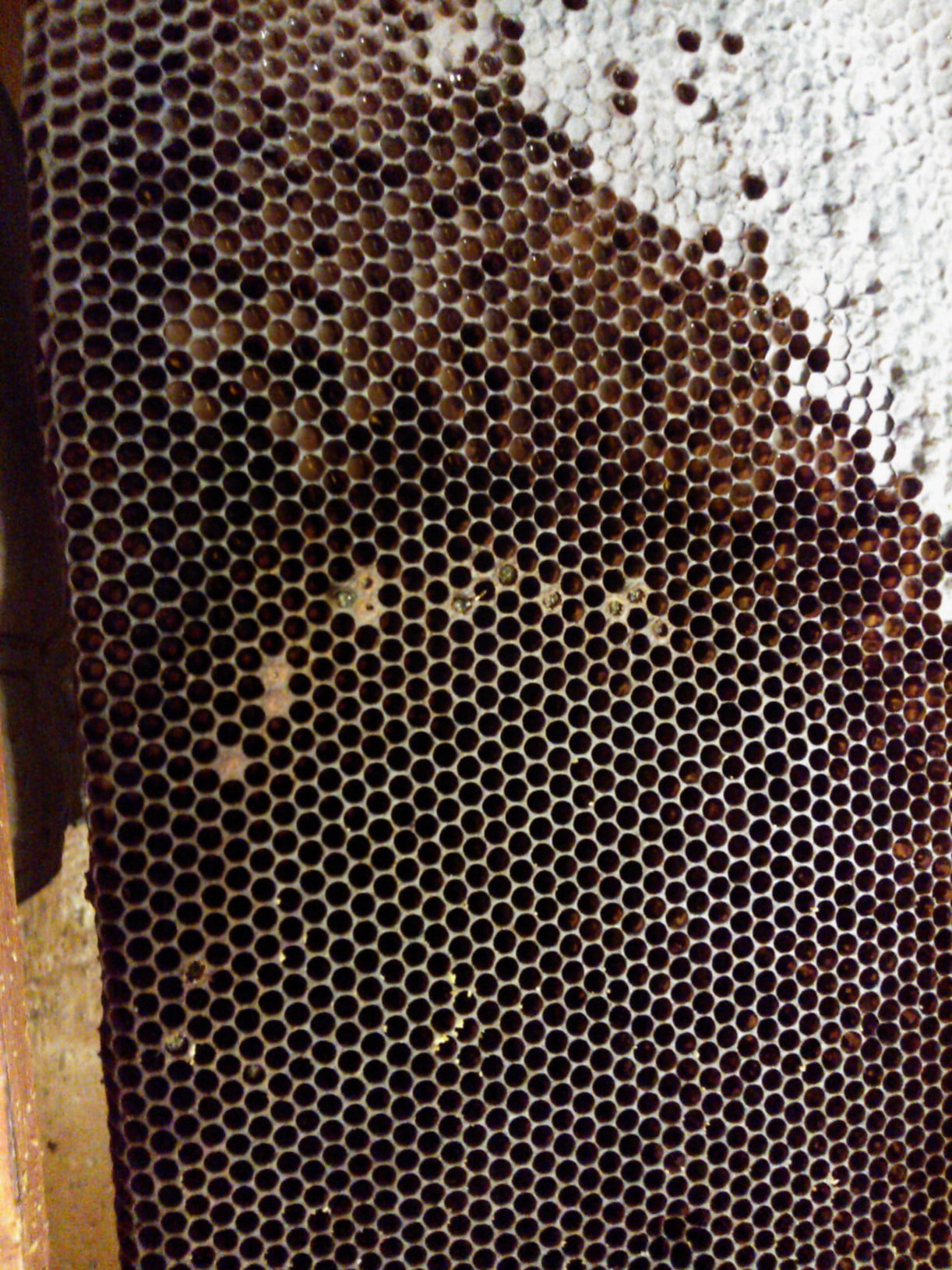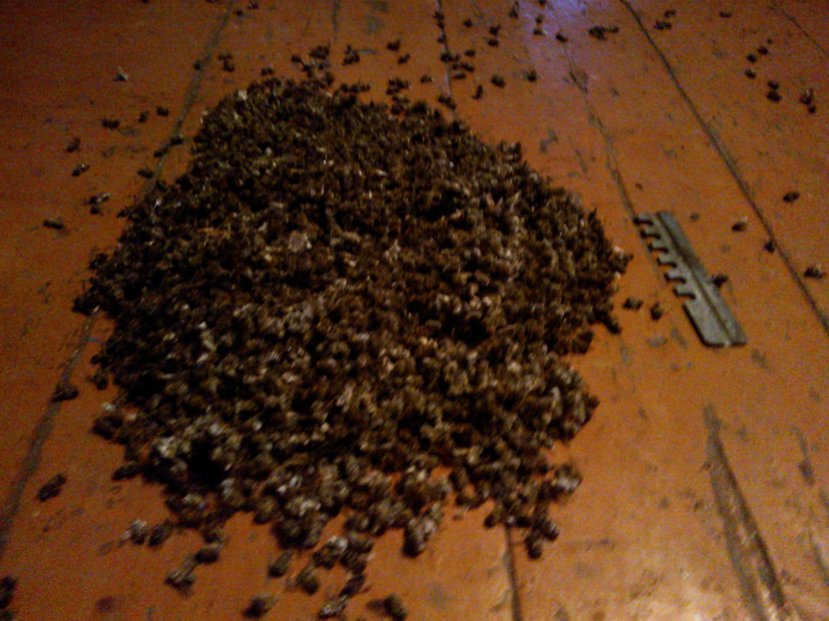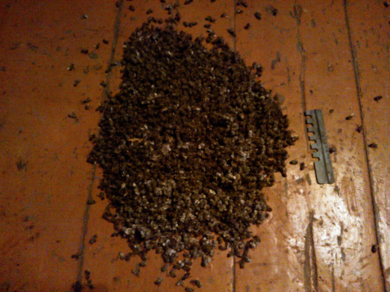 А вот рамка из отошедшей семьи и подмор с неё же. Пчелы было, думаю, вполне достаточно. На верхних брусках незначительные поноса. Ещё клеща обнаружил - в горсти подмора с десяток увидел. Но стал ли именно клещ причиной отхода я бы не стал утверждать. Донья после обработки осенью не менял, возможно, это осыпавшийся. Пчёл убирал в начале декабря. Было ещё 2-3 улочки пчелы. Сталбыть, ещё пару-тройку недель червила. В ячейках вроде даже личинок разглядел. Теперь откачал, зщакормил. подушки нафиг до постановки в зимовник. Пожалел, блин…